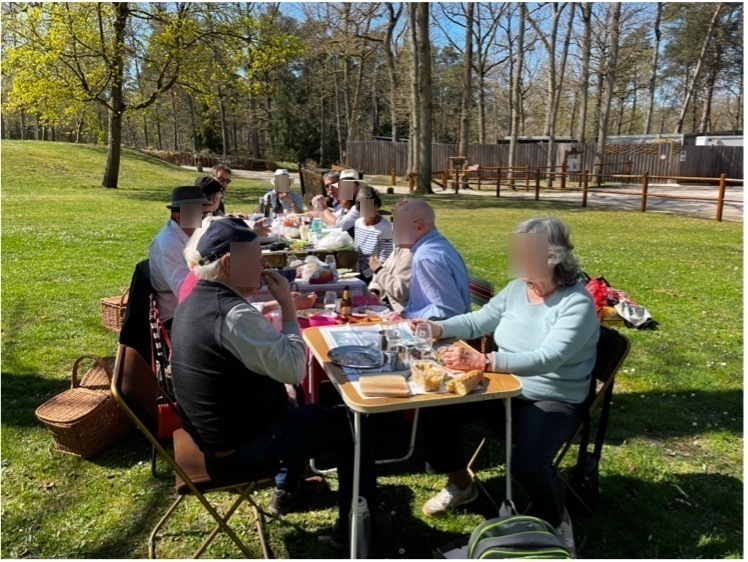 Après avoir récupéré deux équipages à Meaux et traversé la campagne par les routes les plus bucoliques, les huit équipages sont arrivés au château de Fère-en-Tardenois, dans un décor rappelant par moments la forêt de Fontainebleau. Nous y retrouvons notre dernier participant, venu de la région, déjà confortablement installé… bouteille ouverte ! Ce dernier, ayant pris la date du 05/04 au pied de la lettre, est venu avec une berline 504. Les paniers en osier, diverses tartes et bonnes bouteilles sortent alors des coffres. Nous partageons un excellent pique- nique entre le parking rempli de 404 et les ruines millénaires qui surplombent la vallée boisée.